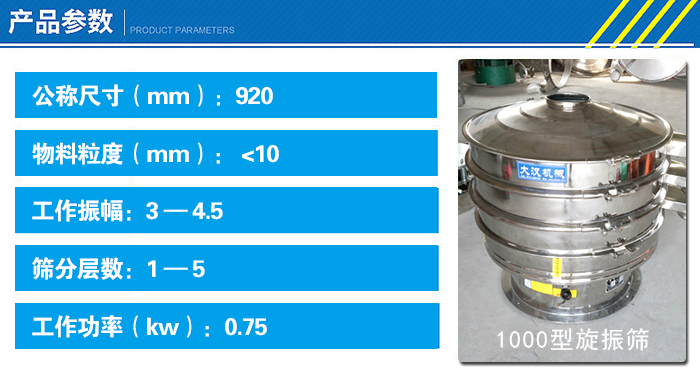 1000型不銹鋼振動篩整機(jī)采用不銹鋼304材質(zhì),篩面直徑920mm,網(wǎng)孔規(guī)格在0.028—5mm之間,搭配功率0.75KW的振動電機(jī)電機(jī),日篩分花椒粉產(chǎn)量可達(dá)500kg-800kg。具體參數(shù)如下: