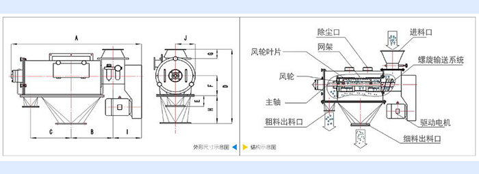 淀粉臥式氣旋篩由進料口、除塵口、網(wǎng)籠、螺旋輸送系統(tǒng)、風輪葉片、風輪、主軸、驅動電機、粗料出料口、細料出料口組成。
