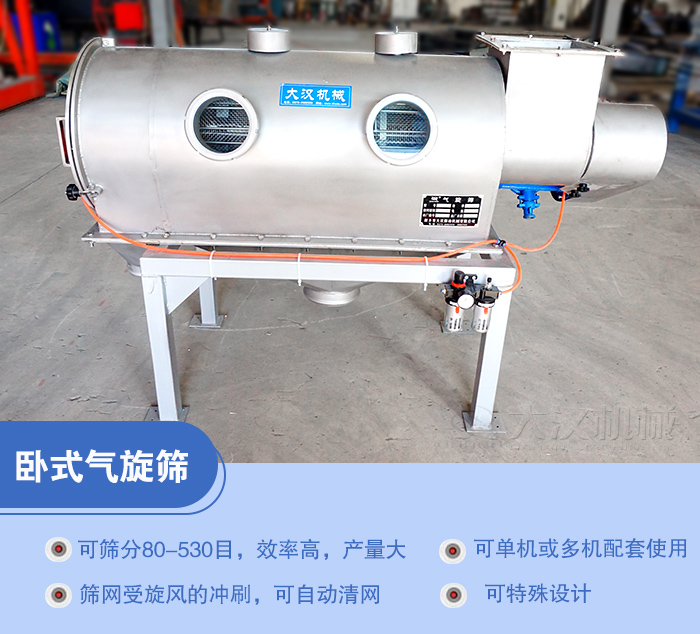 淀粉臥式氣旋篩可對細度范圍在80-500目內的粉狀物料很好的連續(xù)篩分,篩網(wǎng)可任意更換,材質上分為不銹鋼材質與碳鋼材質兩種,通過在密閉狀態(tài)下利用高速氣流作載體,使充分擴散的粉料微粒以足夠大的動能向篩網(wǎng)噴射,達到分級目的。特別適合篩分處理輕比重、粘度大、纖維多、有靜電、易團聚的微粉和特殊物料。