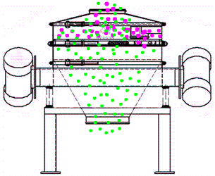 當(dāng)直排篩啟動(dòng)時(shí),物料從進(jìn)料口進(jìn)入篩面,利用振動(dòng)電機(jī)軸上下端的兩組偏心塊的相位角以及交叉角度將振動(dòng)電機(jī)的旋轉(zhuǎn)運(yùn)動(dòng)變?yōu)樗健⒋怪?、傾斜以及離心作用的多作用力重疊,傳遞給篩面,物料在篩面上向四周擴(kuò)散,通過篩網(wǎng)直接從下出料口排出,完成篩分。