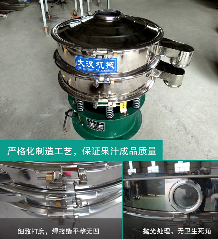 整機精選304不銹鋼材質(zhì),篩機全部進行拋光處理,無衛(wèi)生死角,篩框的焊接處要求進行打磨,焊接縫平整無凹點,完全符合果汁行業(yè)對于衛(wèi)生的要求及標(biāo)準。