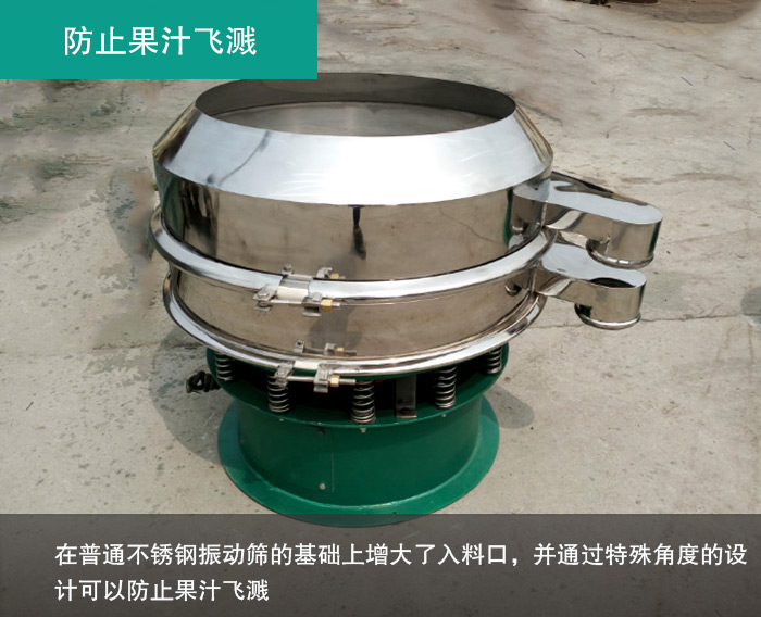 在果汁過濾環(huán)節(jié),常常有用戶反應(yīng)會出現(xiàn)液體飛濺等現(xiàn)象,效果很不好,為此大漢在不銹鋼振動篩基礎(chǔ)上設(shè)計了一款專用于液體過濾的振動篩——加緣式振動篩,它是在普通不銹鋼振動篩的基礎(chǔ)上增大了入料口,并通過特殊角度的設(shè)計可以防止液體類物料飛濺,非常適合果汁類的過濾除雜。